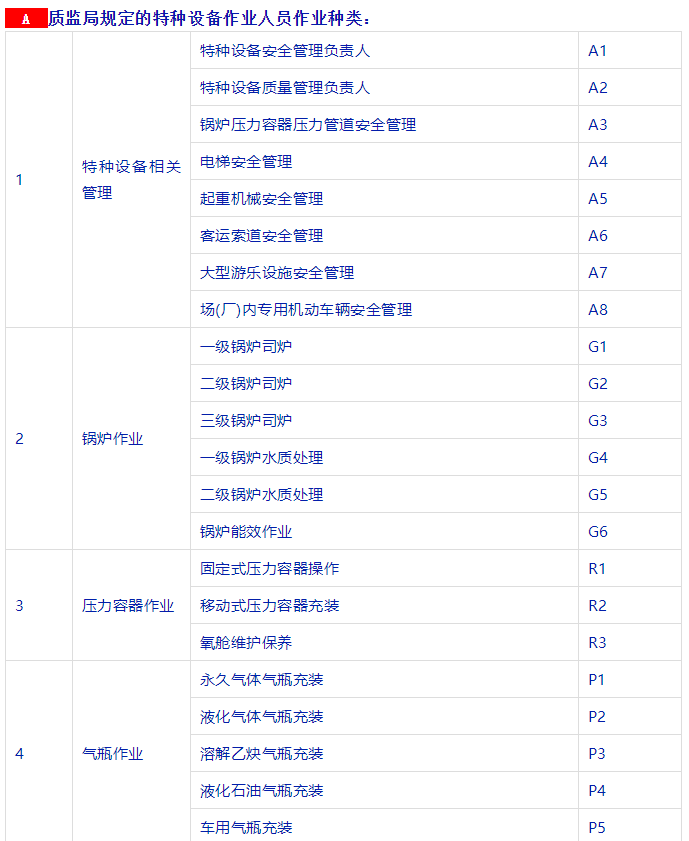 特種設(shè)備安全管理人員、叉車(chē)司機(jī)、起重機(jī)司機(jī)、起重機(jī)指揮、壓力容器、鍋爐、氣瓶充裝、電梯安裝與維修、觀光車(chē)、客運(yùn)索道操作與修理、大型游樂(lè)設(shè)施操作與維修等等。